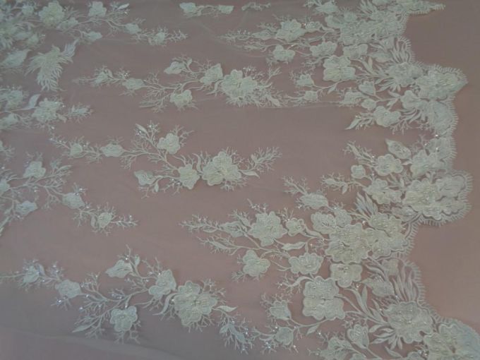 Δαντέλα με χειροποίητα έντονα ανάγλυφα λουλουδένια κεντήματα σε υπόλευκο χρώμα! Τα κεντήματα αυτά που στολίζονται με διακριτικές πέρλες ξεκινούν απο τη βάση της πιο αραια, συνεχίζονται ανεβαίνοντας προς τα πάνω και καταλήγουνπολύ πυκνά στην άλλη άκρη της δαντέλας. Και απο τις 2 πλευρές έχει υπέροχες 'γλώσσες'-τελείωμα! Η δαντέλα αυτή είναι πολύ βαριά, πολύ χυτή και διάφανη. Δημιουργήστε το νυφικό των ονείρων σας με την περίτεχνη αυτή δαντέλα, αλλά κατάλληλη & για το βραδινό σας φόρεμα! Φάρδος 1.40μ. Το νέο σας e-shop 'AELIA' διαθέτει πολλή μεγάλη ποικιλία σε ποιοτικές νυφικές δαντέλες και άλλα υφάσματα σχετικά με το γάμο