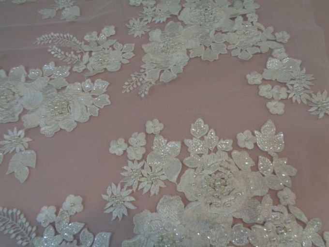 Δαντέλα με χειροποίητα έντονα ανάγλυφα λουλουδένια κεντήματα σε υπόλευκο χρώμα! Τα κεντήματα αυτά που στολίζονται με διακριτικές πέρλες και κάποιες πούλιες ξεκινούν απο τη βάση της πιο πυκνά, συνεχίζονται ανεβαίνοντας προς τα πάνω και καταλήγουν πιο αραιά στην άλλη άκρη της δαντέλας. Η δαντέλα αυτή είναι πολύ βαριά, πολύ χυτή και διάφανη. Δημιουργήστε το νυφικό των ονείρων σας με την περίτεχνη αυτή δαντέλα, αλλά κατάλληλη & για το βραδινό σας φόρεμα! Φάρδος 1.40μ. Το νέο σας e-shop 'AELIA' διαθέτει πολλή μεγάλη ποικιλία σε ποιοτικές νυφικές δαντέλες και άλλα υφάσματα σχετικά με το γάμο