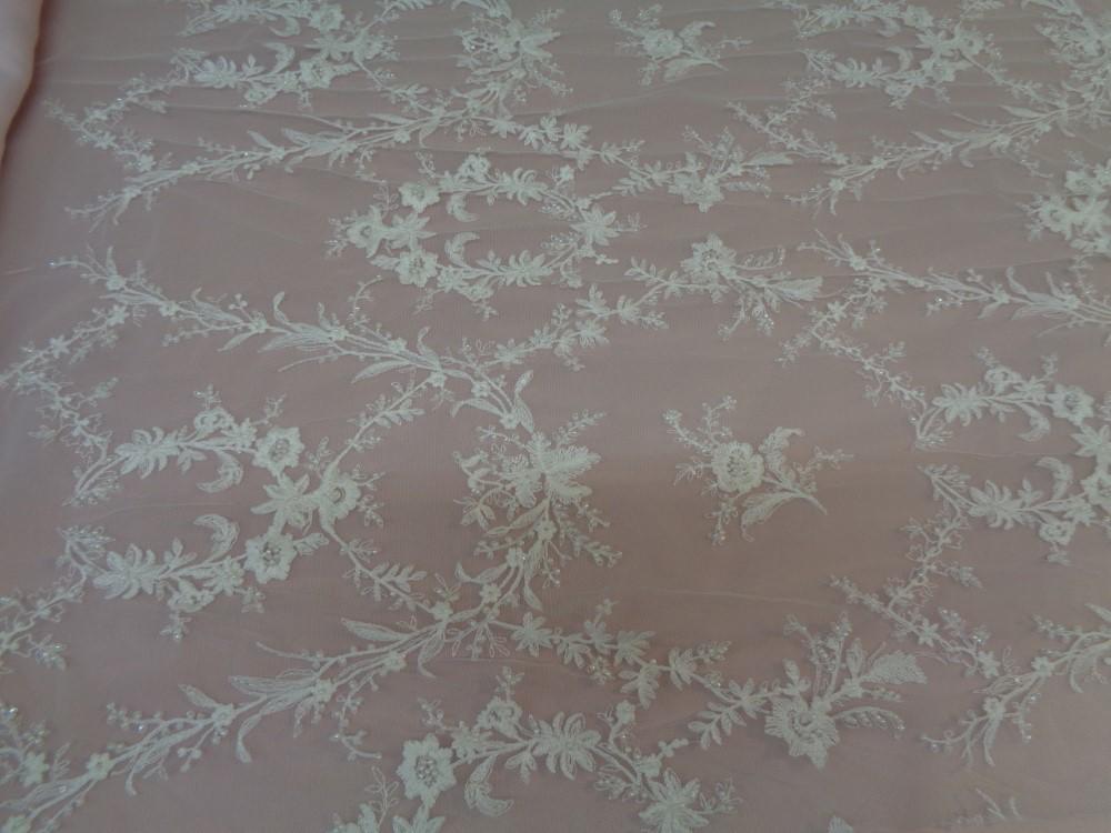 Έργο τέχνης η υπόλευκη αυτή δαντέλα με τα χειροποίητα έντονα ανάγλυφα κεντήματα πάνω σε τούλι. Επίσης έχει πάρα πολύ κομψή μπορντούρα-γλώσσες με τριαντάφυλλα και άλλα φίνα άνθη, ενώ στολίζεται σε αραιά διαστήματα με χάντρες και πούλιες. Το σχέδό της συνεχίζεται κατά μήκος ανεβαίνοντας προς τα πάνω, καταλήγοντας στην άλλη άκρη της δαντέλας. Η δαντέλα αυτή είναι πολύ βαριά, χυτή και διάφανη. Δημιουργήστε το νυφικό των ονείρων σας με την περίτεχνη αυτή δαντέλα, αλλά κατάλληλη & για το βραδινό σας φόρεμα! Φάρδος 1.40μ. Το νέο σας e-shop 'AELIA' διαθέτει πολλή μεγάλη ποικιλία σε ποιοτικές νυφικές δαντέλες και άλλα υφάσματα σχετικά με το γάμο